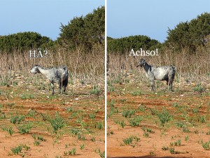 Ich habe die Ziegen aus ca. 50 Metern Entfernung auf einer Ebene entdeckt. Als ich langsam näher ging, wurde ich sofort Entdeckt. Als ich auf ca. 40 Meter war, nahmen sie sofort reiß aus und rannten in das nächst gelegene Gebüsch und weg waren sie. Nur eine einzelne, die am Rand der Herde graste blieb und ließ sich nicht stören. Schön den Kopf im Gras und fleißig am futtern.