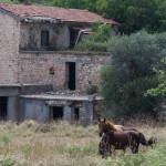 Nach einer weiteren Stunde mit 20km erreichten wir endlich Vretsia. Wir hofften dort ein Restaurant zu finden. Wir hatten einen Bärenhunger. Doch, wir fanden mit Vretsia unser erstes verlassenes Dorf. Es muss mal ein Türkisches Dorf gewesen sein. Direkt in der Dorfmitte steht eine kleine alte Moschee. Daneben standen normalen Häuser, eine Villa, eine Schule, Bauernhöfe und ein Restaurant, in dem sogar noch jemand zu leben scheint. Da hing selbstgemachter Käse. Ziegen bimmelten irgendwo im Tal, eine riesen Sau stand da rum und sogar 2 Pferde standen auf der Weide.