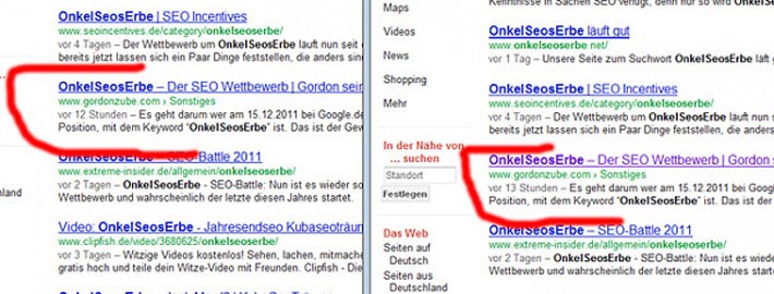 Gleich einmal vorab, bevor euch der lange Artikel abschreckt. Es geht darum wer am 15.12.2011 bei Google.de an der ersten Position, mit dem Keyword „OnkelSeosErbe“ ist. Das ist der Gewinner. Und ich würde mich freuen wenn Du mich unterstützt. Hast Du eine Webseite oder ein Forenprofil oder kannst sonst irgendwo einen Backlink zu dieser Seite setzen, dann würde ich mich darüber freuen. Linke einfach zu dieser Seite.